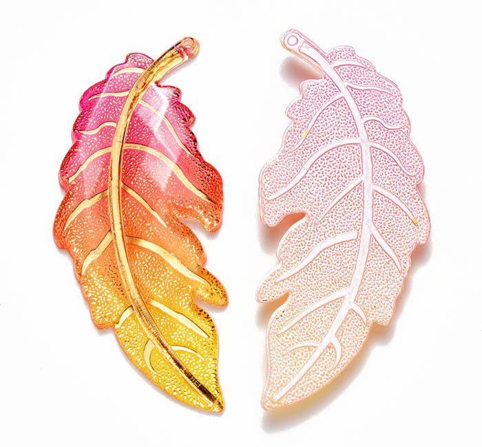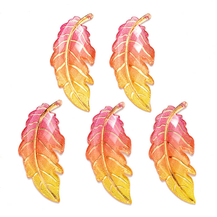 Stort hänge i form av ett löv. Lövet är färgtonat i gul, orange och rosa-röd på ett mycket effektfullt sätt. Ådringarna på framsidan går i guld. Baksidan är också ådrad men vit. Upptill på lövets stjälk finns ett hål för upphängning som är ca 1 mm. Säljes styckvis. Storlek ca 28 x 62 mm.