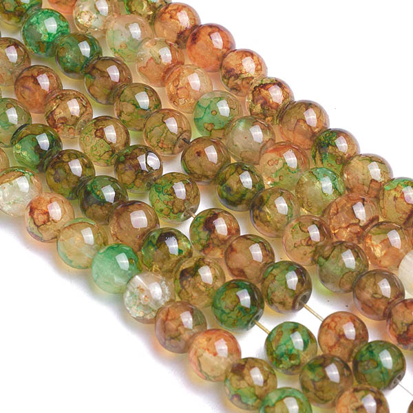 Dekorativa, krackelerade pärlor gjorda av glas. De har ett slumpvis mönster i färgerna grönt och orange. Priset avser en påse med 12 pärlor. Storlek ca 10 mm, hålet är ungefär 1,5 mm.
