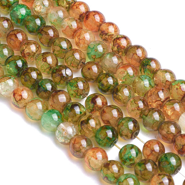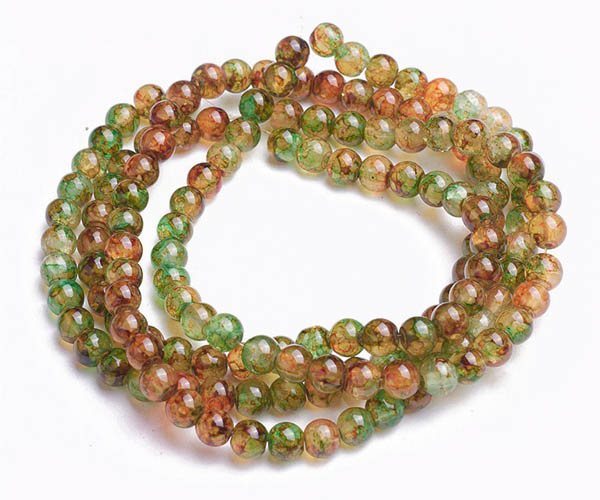 Dekorativa, krackelerade pärlor gjorda av glas. De har ett slumpvis mönster i färgerna grönt och orange. Priset avser en påse med 60 pärlor. Storlek ca 4 mm, hålet är ungefär 0,85 mm.