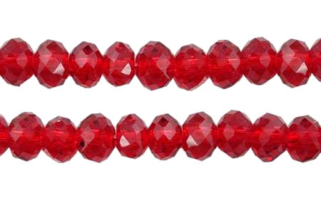 Facettslipad rondell av röd kristall (transparent och genomfärgad). Slipningen av dessa rondeller gör att de glittrar väldigt effektfullt! Priset avser ca 90 pärlor. Storlek 4 x 6 mm.