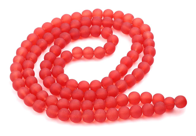 Röda pärlor av frostat glas. Priset avser en sträng/påse med ungefär 50 pärlor. Storlek ca 8 mm.