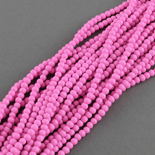 Pärlor av glas lackade i bubbelgums rosa färg (drar något åt det lila hållet). Priset avser en sträng med ca 70 pärlor. Någon enstaka pärla kan ha lite oregelbunden form, därav sänkt pris. Storlek ca 6 mm.