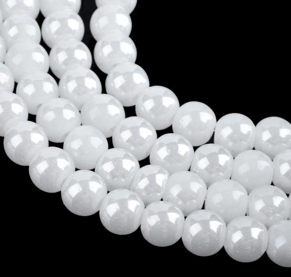 Vita glaspärlor med vacker pärlemolyster. Priset avser 40 st pärlor. Storlek ca 8 mm, hålet är ungefär 1,5 mm.