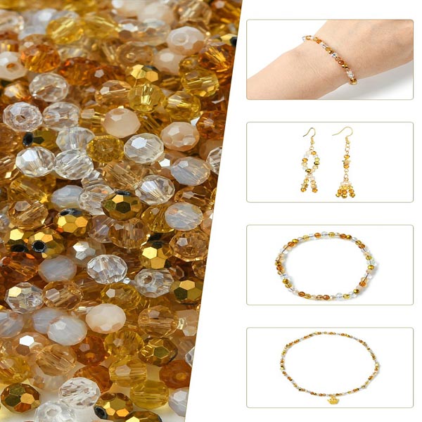 Facetterade pärlor av glas i en härlig blandning med bl a gul och guldiga färger, se bild. Säljes i storpack (ca 500 st) till ett extra förmånligt pris! Pärlornas storlek är ca 4 mm, hålet är ungefär 0,7 mm.