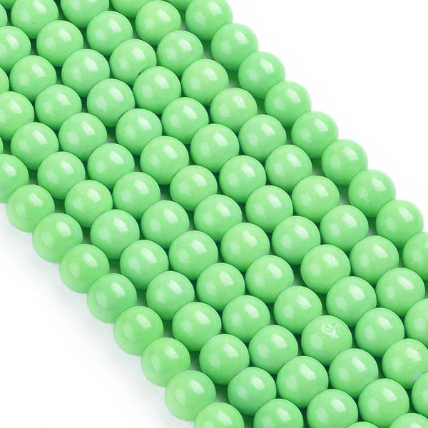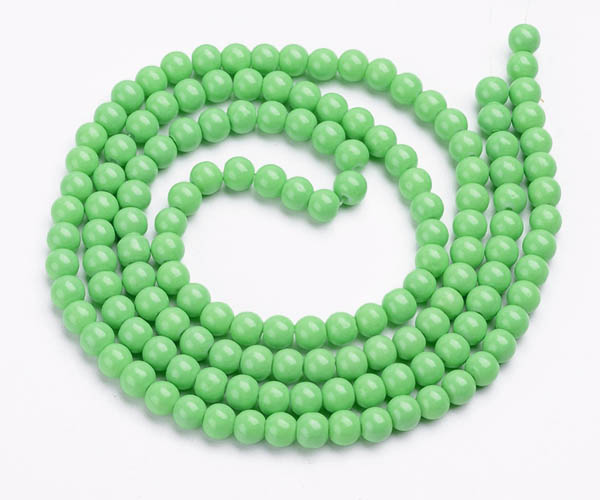 Pärlor gjorda av glas lackade i läckert grön färg. Priset avser 50 st. Storlek ca 6 mm, hålet är ungefär 1,5 mm.