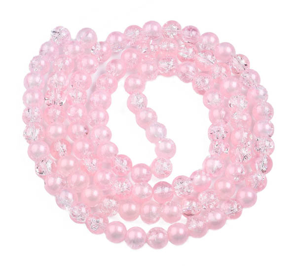 Ljust rosa, krackelerade pärlor av glas. En del av varje pärla har en extra metalic lyster vilket gör pärlorna mer effektfulla. Priset avser en påse med 40 st. Storlek ca 8 mm, hålet är ungefär 1,2 mm.