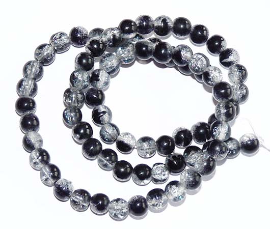 Glittrande pärlor i svart och transparent glas. Den här sortens pärla brukar kallas "crackle". Det ser ut som krossad is inuti vilket ger en väldigt effektfull pärla. Priset avser en sträng (ca 53 pärlor). Storlek 8 mm.