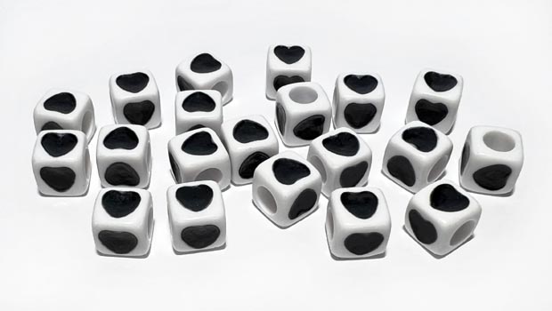 Kubformade, vita pärlor med svarta hjärtan (ett på var sida om pärlan). Pärlorna är gjorda av akryl och säljs i påsar med 20 st. Storlek ca 7 mm, hålet är ungefär 4 mm.