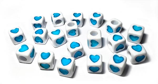 Kubformade, vita pärlor med turkosa hjärtan (ett på var sida om pärlan). Pärlorna är gjorda av akryl och säljs i påsar med 20 st. Storlek ca 7 mm, hålet är ungefär 4 mm.
