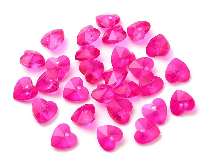 Starkt rosa/cerise hjärta gjort av facetterat glas. Hänget ser likadant ut på båda sidor. Det finns ett hål upptill så med hjälp av en öppningsbar ring får du lätt ett vackert hänge. Säljes styckvis. Storlek ca 18 mm, hålet är ungefär 1,5 mm och går från hängets fram- till baksida.