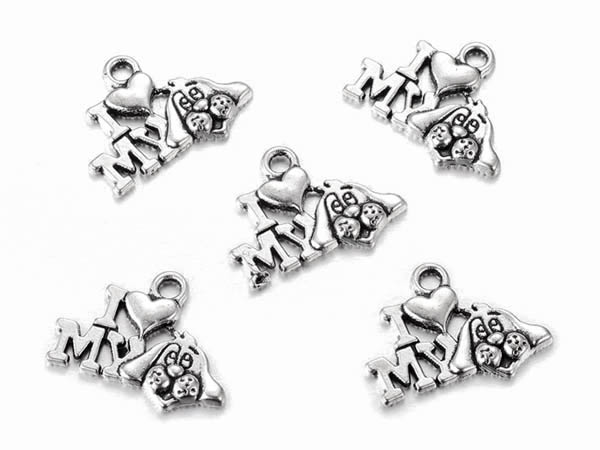 Hänge gjort av silverpläterad metall (antik silver). Hänget har text "I love my dog" men istället för dog (hund) är det en bild på en hund och istället för love är det ett hjärta, se bild. Priset avser 5 st. Storlek ca 14 x 18 mm.